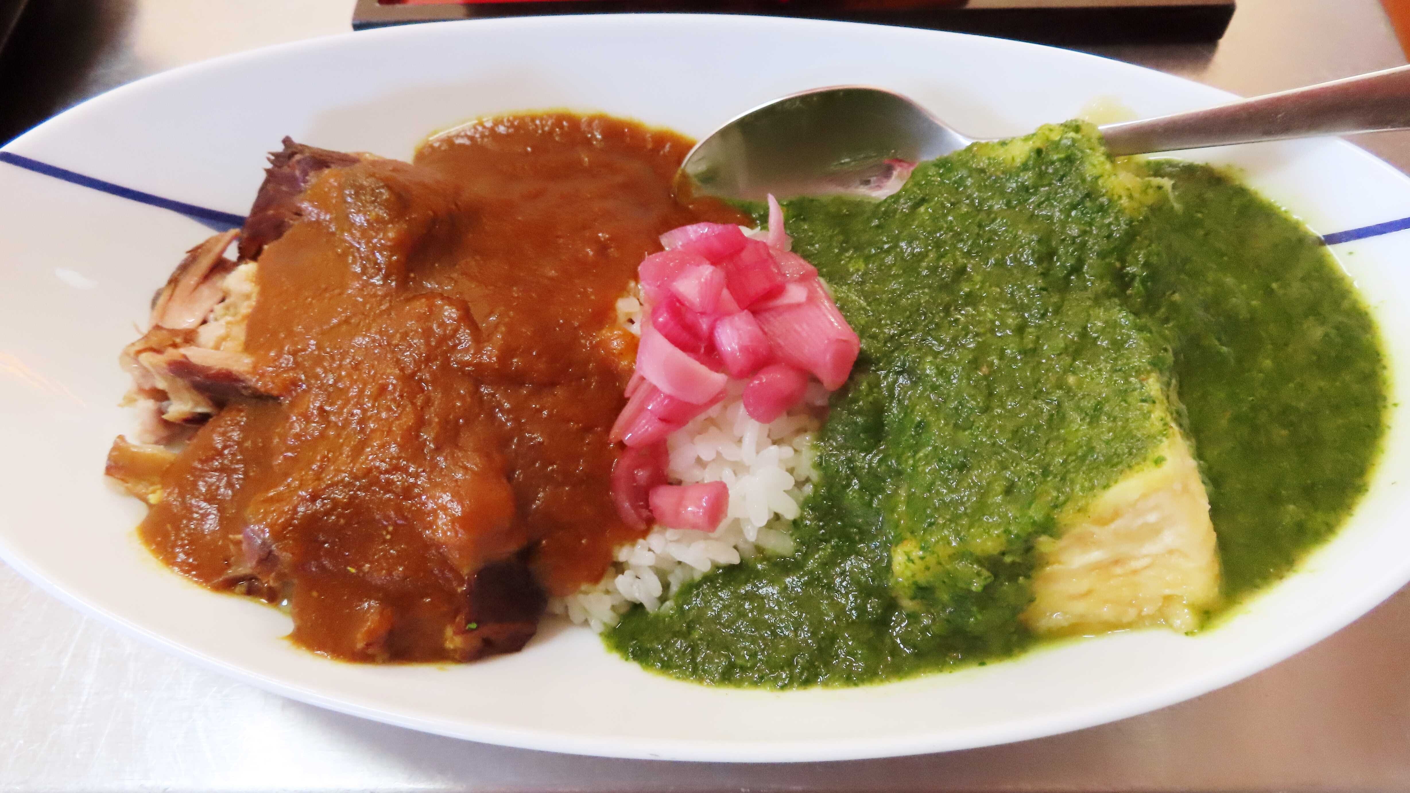 「カレー」 豚バラ肉のビール煮カレー(左)、揚げだし豆腐のほうれん草カレー(右)の相がけ。トッピングは茗荷の酢漬け。