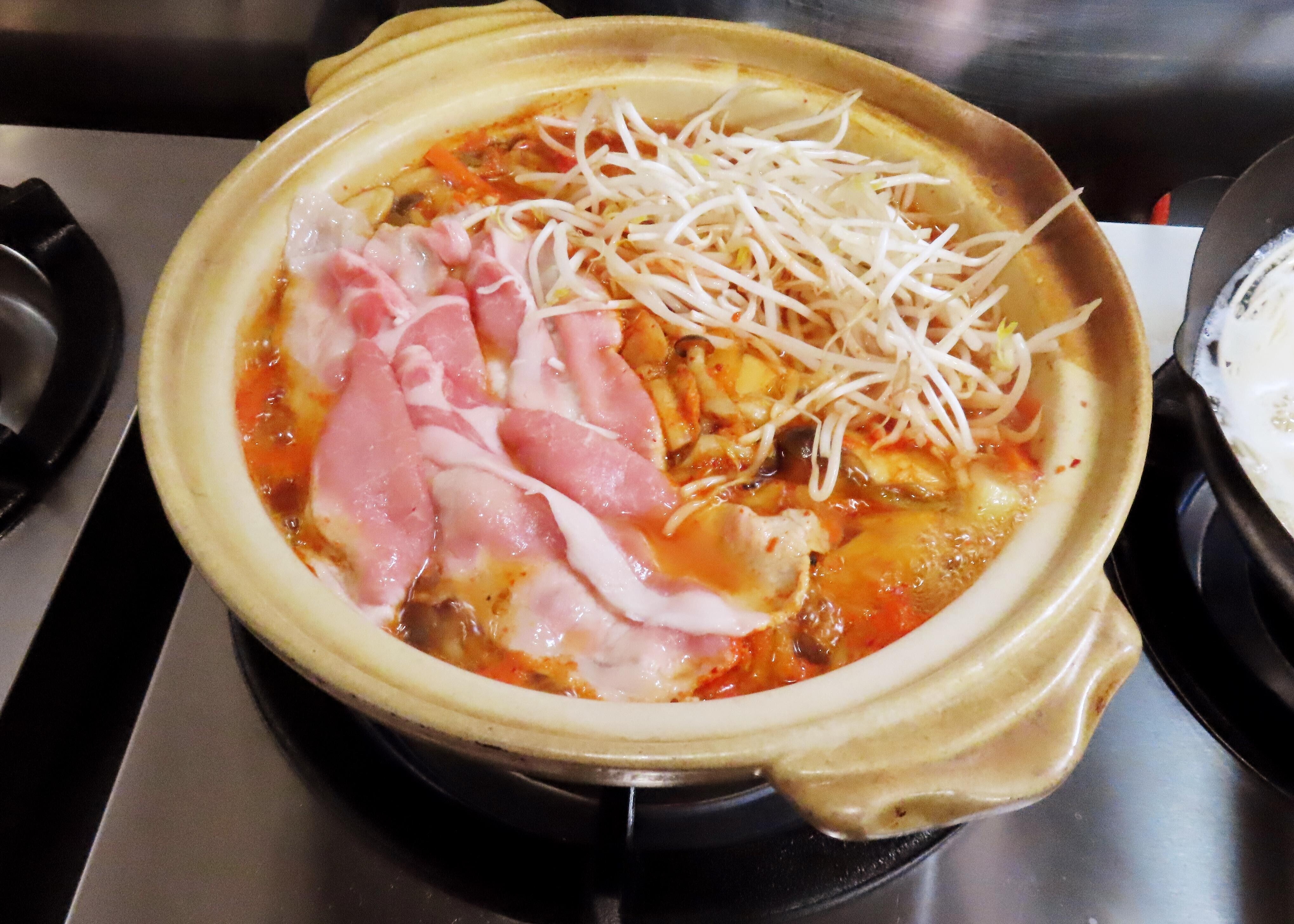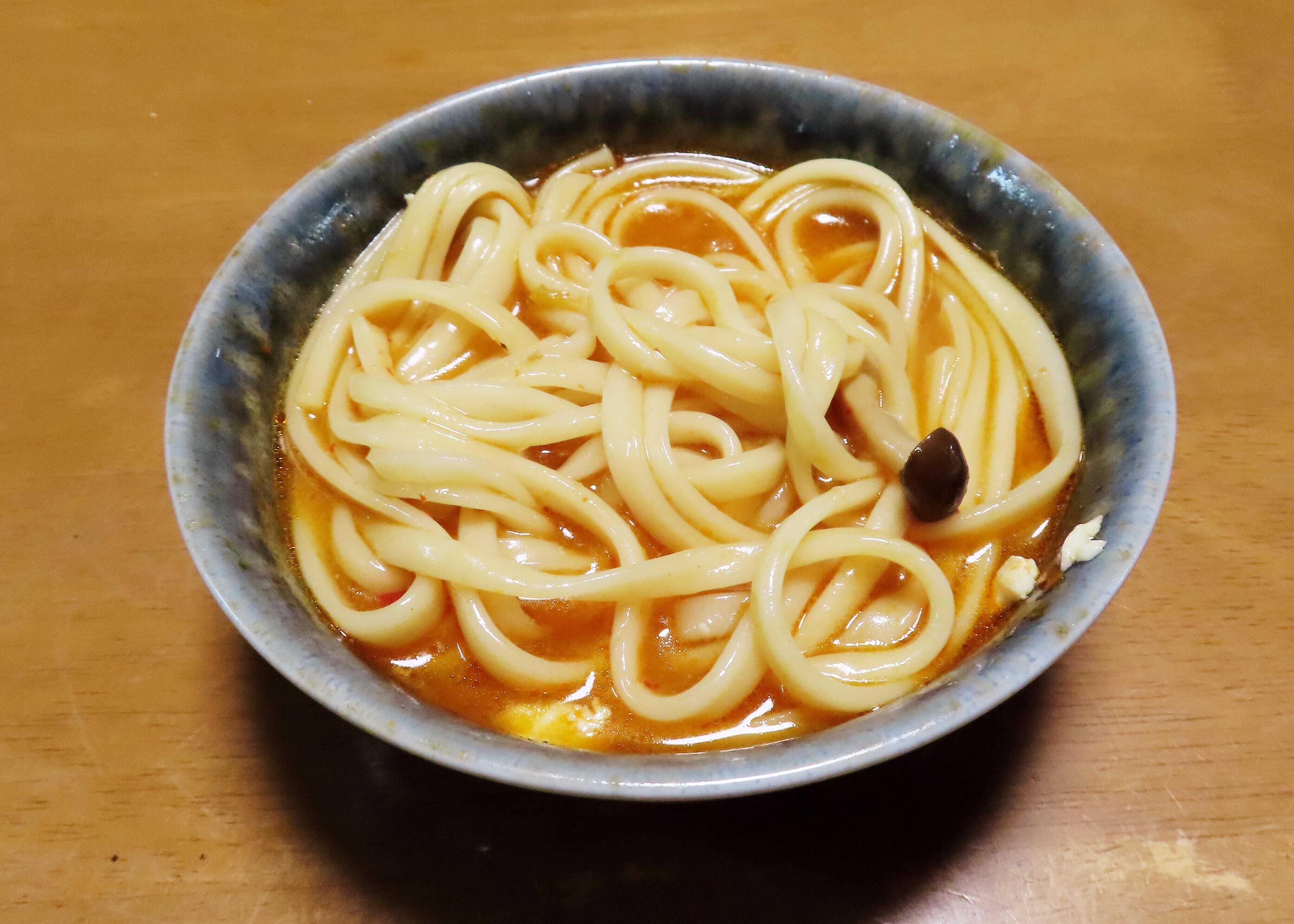 夕食は体の温まる「キムチ鍋」にした。具はキムチ、しゃぶしゃぶ用の豚ロース肉、しめじ、もやし、大根、人参、豆腐、油揚げだ。〆は「笠岡うどん」。